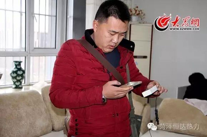 劉明賢在D棟12樓居民張大爺家中測試溫度,室溫剛剛達標,劉明賢和任永輝開始查找原因