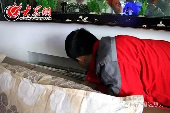 任永輝鉆進沙發(fā)縫里,查看沙發(fā)后面的供熱管道,濾網(wǎng)有些臟,任永輝決定清洗管道
