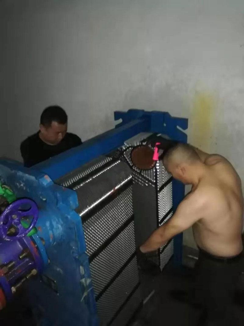 到達(dá)現(xiàn)場時,泵房內(nèi)地面已經(jīng)積水約2厘米深。“一開始,我們想不拆卸換熱器,直接進(jìn)行局部堵漏,防止漏水噴濺造成泵房其他換熱機(jī)組進(jìn)水連電。因為換熱器是大型設(shè)備,通常我們4個人一起配合,還需要將近6小時才能拆卸并安裝完畢,而我們只有2個人。后來發(fā)現(xiàn),在上百個緊密排列的換熱片中,漏點的位置十分隱蔽,難以有效進(jìn)行封堵。”