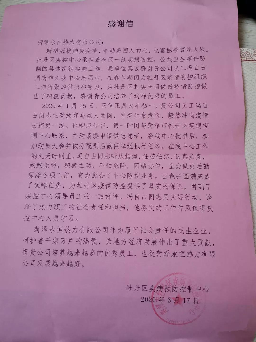 2020年初,疫情來襲,牽動著國人的心,也深深牽動永恒熱力運(yùn)營管理二部管理員馮自占的心,一夜輾轉(zhuǎn)反側(cè)后,他第一時間與菏澤市牡丹區(qū)疾病控制中心取得聯(lián)系,主動請纓申請做志愿者,經(jīng)批準(zhǔn),被分配到后勤保障組執(zhí)行任務(wù)。1月25日,正值正月大年初一,馮自占主動放棄與家人團(tuán)圓,冒著生命危險(xiǎn),義無反顧沖向疫情防控第一線。“我不是醫(yī)生,不能再次奔赴前線,救危難于生死,那我就多做些力所能及的事情”,事實(shí)上馮自占也是這么做的,他出色并圓滿完成了保障任務(wù),被牡丹區(qū)疾病預(yù)防控制中心授予了“新型冠狀病毒肺炎防控優(yōu)秀志愿者”稱號。