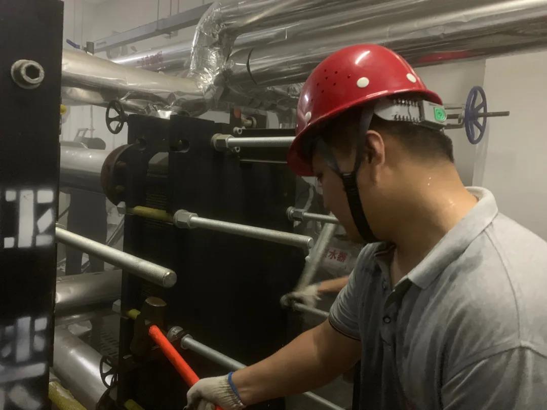 6月17日,在中南世紀錦城小區(qū)換熱站內(nèi),永恒熱力公司運營管理四部全體員工正汗流夾背地進行換熱機組清洗工作。即日起,他們將對轄區(qū)各小區(qū)熱力站換熱機組開展全面清洗維護,為今冬供熱運行做好準備。