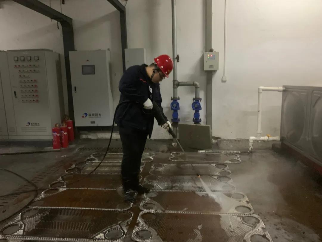 換熱站大多位于地下,空間狹小、十分悶熱,再有高壓水槍“加持”,整個換熱站內(nèi)霧氣蒙蒙,猶如“仙境”。幾個動作下來,運營管理四部全體人員已是汗流如注。大家踩著濕漉漉的地面,動作一刻不停歇,換熱站內(nèi)水花四濺,現(xiàn)場人員熱火朝天。