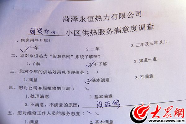 大眾網(wǎng)記者在現(xiàn)場看到,永恒熱力工作人員還向市民發(fā)放一張小區(qū)供熱服務滿意度調(diào)查表,調(diào)查表上,市民可對供熱效果、客服保修、維修工作人員的服務態(tài)度等事項進行評價,各小區(qū)的供熱服務質(zhì)量也由此直接呈現(xiàn)出來。菏澤永恒熱力相關負責人介紹,他們將根據(jù)調(diào)查結(jié)果,改進供熱服務方式,持續(xù)提高服務質(zhì)量。