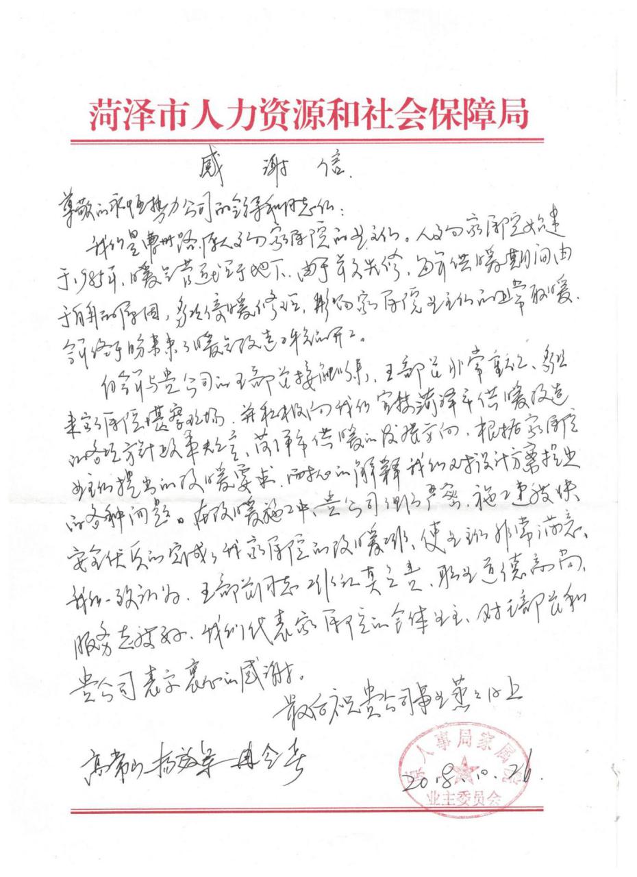 10月26日,永恒熱力辦公室收到了一封來(lái)自曹州路人事局家屬院業(yè)主委員會(huì)的感謝信。信中對(duì)永恒熱力特別是運(yùn)行管理二部的供暖服務(wù)工作給予了高度評(píng)價(jià)和贊揚(yáng)。